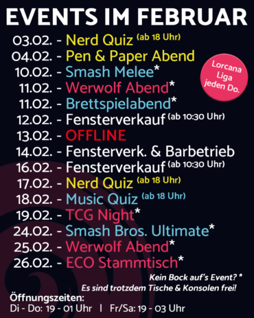 Im Februar gibt's natürlich wieder unsere allseits beliebten Eventreihen. Außerdem habt ihr zum ersten Mal seit Jahren die Möglichkeit das Lost Level auch an Karneval zu besuchen. Nur nicht ganz wie ihr es euch vorstellt: Wir machen Fensterverkauf für euch! Am 14. Februar öffnen wir allerdings auch ganz normal Abends für euch.