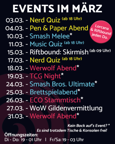 Im März gibt's natürlich wieder unsere allseits beliebten Eventreihen. Riftbound startet nicht nur mit der wöchentlichen Nexus Night durch, sondern auch direkt mit dem ersten großen Turnier am 15. März ab 09 Uhr morgens. Zusätzlich bieten wir für die WoW Spieler unter euch eine Gildenvermittlung an 27. März an. Ihr sucht neue Gildenmitglieder oder einfach…