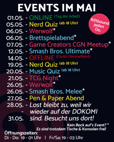 Neben unseren allseits beliebten Eventreihen bleibt es im Mai etwas ruhiger bei uns, weil wir uns mit voller Vorfreude auf die DoKomi Messe in Düsseldorf vorbereiten. Vom 29. bis zum 31. Mai findet ihr das Lost Level als Stand in Halle 5 auf der DoKomi. Besucht uns und genießt einen unserer Bestseller-Cocktails oder ein kühles…