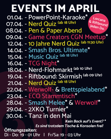 Powerpoint-Karaoke am 01. April (kein Scherz!) Das 10 Jahre Nerd Quiz Special am 12. April. Der heiß begehrte Nerd-Flohmarkt am 18. April. Und das erste 2XKO…