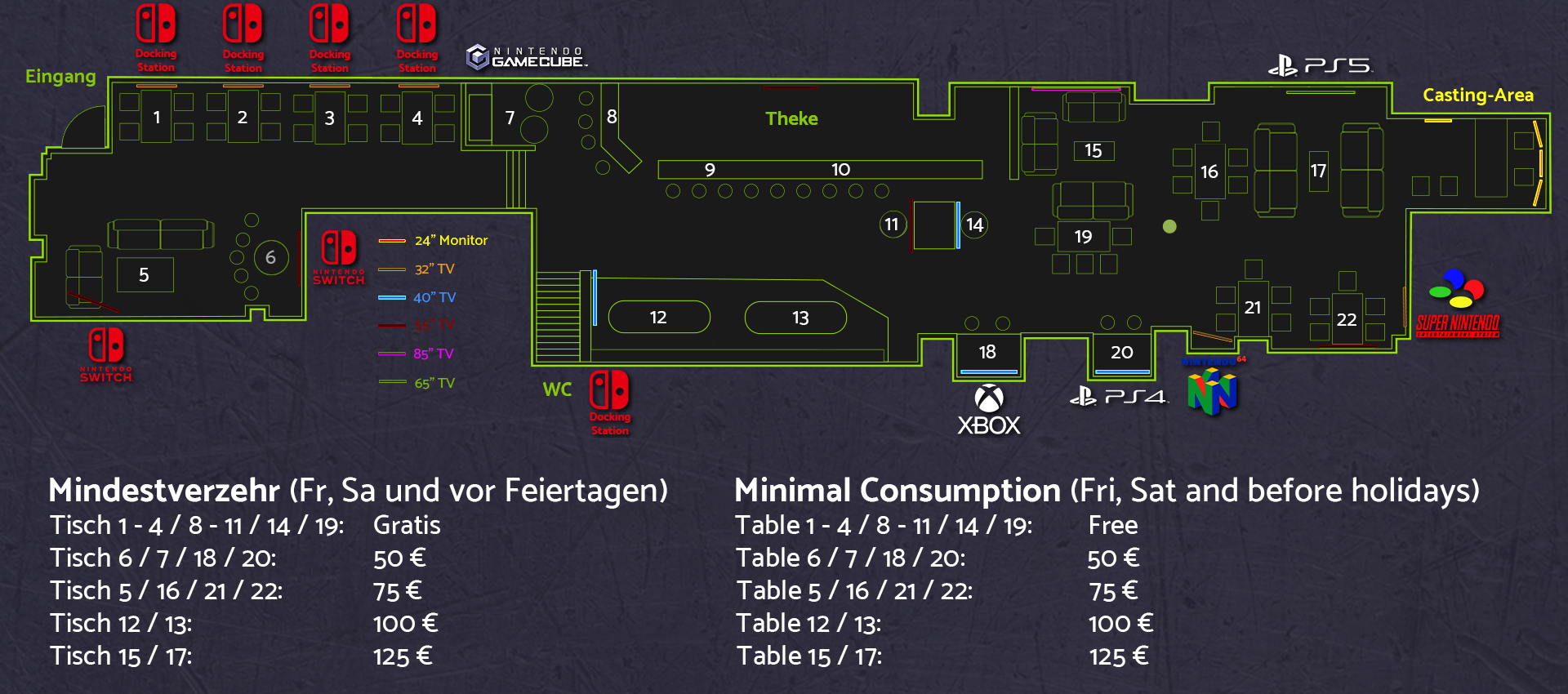 - Am Wochenende und vor Feiertagen: 50–125 € pro Tisch (abhängig von Tischgröße/Konsolenplatz, Preise siehe Grundriss).